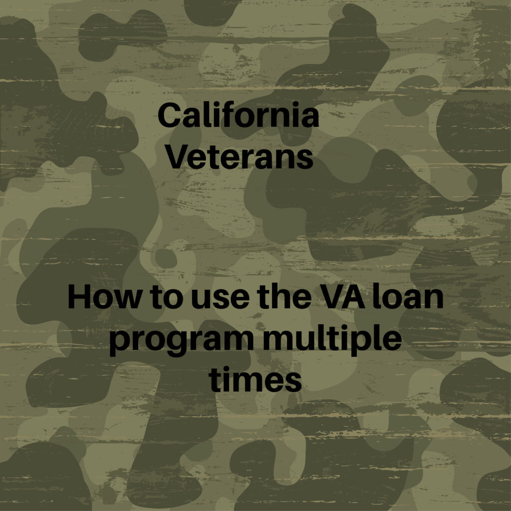 Not many California Veterans realize they can use their VA Entitlement to purchase a home more than once. There is no limit to how many times the VA loan program can be used for a home purchase. While many California Veterans think of the VA loan program as a “First Time Buyer” program, it has many advantages over another type of home financing, even when the California Veteran plans to use a down payment for their home purchase.